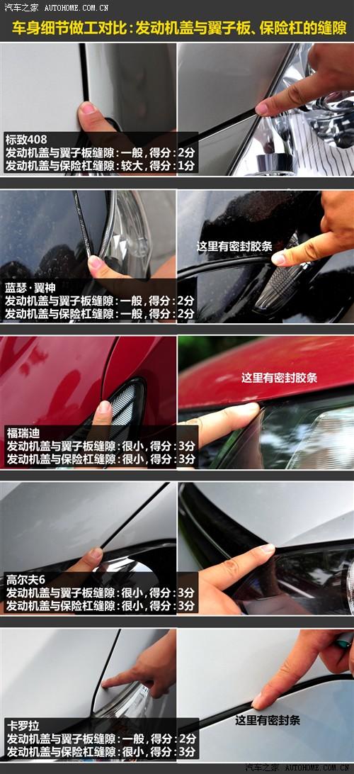 在這一環(huán)節(jié)的對(duì)比中,得分最高的高爾夫占了很大的便宜,其實(shí)是因?yàn)樗捎昧思す夂附拥能図,而出乎我們意料的不是高爾夫,而是福瑞迪,他的鈑金縫隙控制非常好,發(fā)動(dòng)機(jī)蓋與翼子板和保險(xiǎn)杠的接縫都非常小,在10款車中都是最小級(jí)別的。