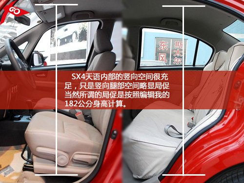 既然是跨界與SUV,那么想當然的天語一定會有SUV的一大特點,即是相對于轎車更加寬大的車內空間,而在天語SX4的內部,如果你的身高不高于180cm的話,那么天語完全可以給你很不錯的車內空間享受,只是其內部乘坐感受硬邦邦的,比如內飾材質以及座椅與身體接觸的感覺等等,缺少了很多轎車應有的乘坐舒適性。