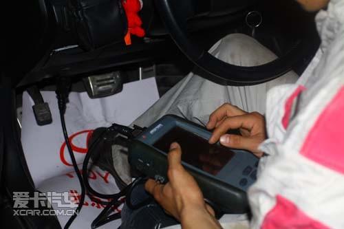 工人用儀器接入到行車電腦檢測故障