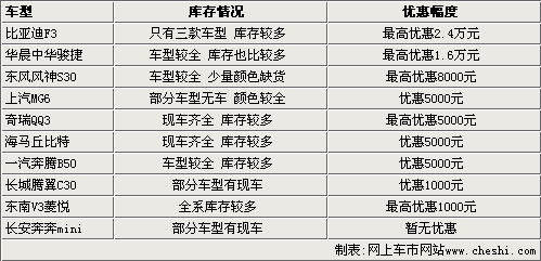 我們這次選擇了10款市場上銷售火爆的自主品牌車型,比如比亞迪F3、駿捷、奇瑞QQ3等車型。通過對北京市場的調查發(fā)現(xiàn),東南V3菱悅CVT、騰翼C30等新車型上市后,現(xiàn)車都能很快進入終端市場,而且出現(xiàn)了一定的優(yōu)惠幅度。而比亞迪F3、駿捷等熱銷車型,也隨著新老產品的更新?lián)Q代,庫存壓力變大,從而使優(yōu)惠幅度也變的更多。