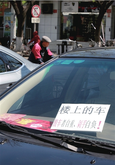“毀車者自重、剁手自負(fù)!”昨天,東城區(qū)東四北大街43號一輛掛著警示牌的“牛車”引得路人駐足觀看、拍照。車主金先生說,放狠話是因?yàn)樗能囋谕\噲龆啻伪粍,希望以此嚇退劃車人?