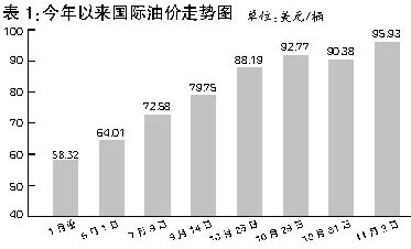 國內油價上漲最直接的因素就是國際油價的大幅攀升。上周國際市場原油價格連創(chuàng)歷史新高,達到了94美元/桶。而在此前,紐約WTI原油期貨價格2007年年初價格為58.32美元/桶,3月份以后國際市場原油價格開始上漲,特別是近兩個月加速上升,9月14日和10月29日分別突破了每桶80美元和90美元。11月2日紐約原油期貨價格大幅上揚,比前一個交易日上漲2.44美元,終盤再創(chuàng)新高,收于每桶95.93美元。這個價格比起今年年初上漲了近40美元,漲幅超過80%。此間,國際油價雖然出現(xiàn)過小幅回落,但高位震蕩的格局一直難以改觀,甚至有愈演愈烈之勢。