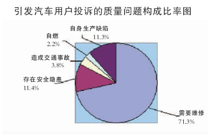 統(tǒng)計(jì)顯示,2007年3季度,用戶對(duì)汽車質(zhì)量的投訴在總投訴量中仍占多數(shù),汽車質(zhì)量問題投訴占65.7% ,服務(wù)質(zhì)量投訴為34.3%。汽車質(zhì)量投訴中反映較多的問題來自發(fā)動(dòng)機(jī)、變速箱、空調(diào)系統(tǒng)、輪胎及油耗多等方面。其中,輪胎問題的投訴增長較快。