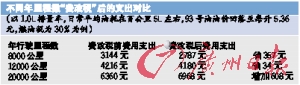 可以看出,按照現(xiàn)行油價(jià)計(jì)算,對于大部分車主來說,燃油稅率越高,所需支付的燃油部分的養(yǎng)車成本比重將更高;對于不同車型來說,排量越高,費(fèi)改稅之后所需要支出的費(fèi)用也越多;對于相同車型來說,每年行駛里程數(shù)越多,費(fèi)改稅之后所需要支出的費(fèi)用也越多。即使在燃油稅開征后,93號油油價(jià)回落至今年年初的每升5.36元,對于一輛一年行駛10005公里、油耗在5.0L每百公里左右的1.0L排量小車來說,在費(fèi)改稅之后,還是需要多支付200多元油錢。