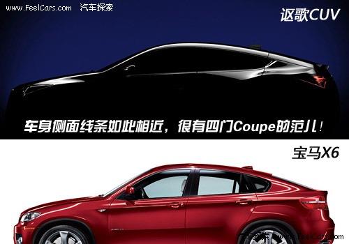 它正是前一陣才剛剛曝光的全新謳歌CUV(Car-Based Utility Vehicle),從字面上看也是一款Crossover車型。與之前披露的諜照或合成圖相比,此次曝光的官方圖赤裸裸的向寶馬X6發(fā)起了挑釁。從車身整體的造型來看,這款尚沒有定名的新車完全如X6一般有著四門Coupe轎跑車的影子;同時,在細節(jié)之處也進一步深化這種概念,它有隱藏式的后門把手(意大利轎跑慣用設計)、異常凸出的前后輪拱以及同TL一般的尖銳尾燈造型等。