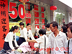 國(guó)慶節(jié)期間七天的假期對(duì)于中國(guó)內(nèi)地的許多商家來(lái)說(shuō)可謂商機(jī)多多,福州閩臺(tái)商行的售貨小姐將服裝擺到店門口以方便顧客挑選。