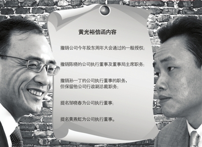 雖然黃光裕的經濟犯罪已經一審宣判,但黃光裕對上市公司的業(yè)績并不滿意,因此他要求舉行臨時董事會,并提出動議:包括撤銷公司今年股東周年大會通過的一般授權;撤銷陳曉公司執(zhí)行董事及董事局主席職務;撤銷孫一丁公司執(zhí)行董事的職務,但保留其為公司行政副總裁職務;提名鄒曉春、黃燕虹為公司執(zhí)行董事。