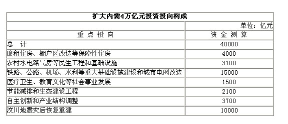 為了應對金融危機,2008年底,我國在出臺促進經(jīng)濟平穩(wěn)增長、改善民生、調整結構的一攬子計劃,并確定了防止資金被擠占挪用的檢查督察機制,以及引導民間資本擴大投資的方針政策。這項計劃涉及總投資4萬億元,包括中央投資總額為11800億元。