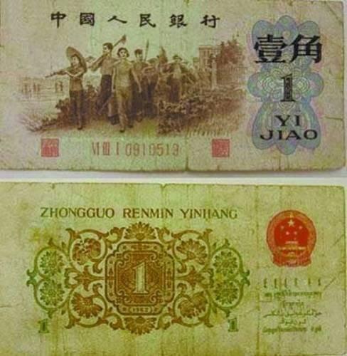 “背綠水印壹角于1962年印刷,其正面為深棕色,與普通的壹角票面無異,但背面卻有部分顏色為墨綠色,故集幣界稱之為‘背綠壹角’!奔瘞艑<冶硎,由于印刷時采用的鈔票紙不同,“背綠壹角”有帶五星水印和無水印兩種版式,其中帶五星水印的“背綠壹角”存世量十分稀少。有媒體報道,在2000年以前,背綠水印壹角從未發(fā)現過贗品。近年來,由于升值很快,造假者采用各種高科技手段進行偽造,市面上逐步出現了贗品。