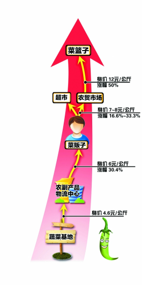 新華社“新華視點(diǎn)”記者日前調(diào)查發(fā)現(xiàn):目前蔬菜生產(chǎn)和流通環(huán)節(jié)出現(xiàn)一些怪現(xiàn)象,從批發(fā)市場(chǎng)到城內(nèi)的零售市場(chǎng),蔬菜加價(jià)往往超過(guò)50%,其中少數(shù)菜品價(jià)格甚至翻倍。