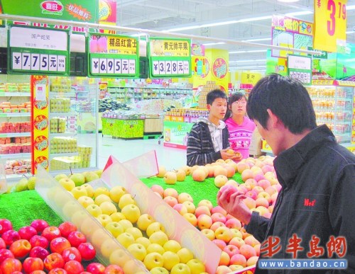 26日上午,記者走訪了家樂福、佳世客、大潤發(fā)等超市,發(fā)現(xiàn)質(zhì)量比較好的紅富士定價全都在七元左右。“這哪是蘋果旺季啊,價格比淡季賣得都高。”不少顧客瞅瞅紅彤彤、新鮮香甜的大蘋果,再看看“價格不菲”的標價牌,望而卻步。