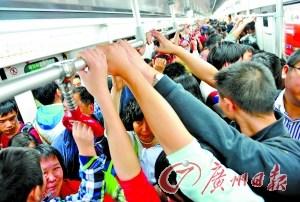 4日的體育西路站,車廂內(nèi)的乘客擁擠不堪。記者喬軍偉攝