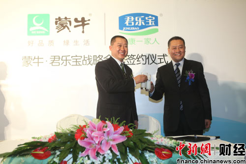 中新網(wǎng)11月22日電 蒙牛乳業(yè)集團(tuán)和君樂寶乳業(yè)22日在北京聯(lián)合召開戰(zhàn)略合作新聞發(fā)布會(huì),蒙牛將投資4.692億元持有君樂寶乳業(yè)51%股權(quán),成為君樂寶的最大股東。此次合作將成為中國(guó)乳業(yè)近兩年來影響最大的一次合作,預(yù)示著中國(guó)乳業(yè)聯(lián)合、重組、兼并收購(gòu)“浪潮”的來臨。