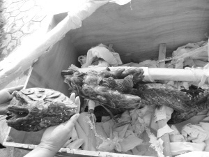 昨天,王女士提供了兩組圖片。一組是廈門寄件時(shí)的圖片,圖片顯示當(dāng)時(shí)玉龍雕被包裹得嚴(yán)嚴(yán)實(shí)實(shí)的。一組是加拿大客戶收件時(shí)的圖片,圖片顯示碩大的木箱里裝滿了泡沫、紙張等填充物,但玉龍雕卻掉了一條腿。