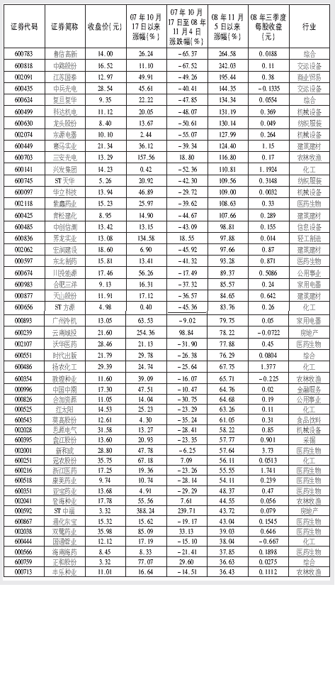 據(jù)中國(guó)證券報(bào)信息數(shù)據(jù)中心統(tǒng)計(jì),這73只股票可分為兩類(lèi)。一類(lèi)是先抑后揚(yáng),自2007年10月16日至2008年11月4日,有50只股票隨大盤(pán)下跌出現(xiàn)同步調(diào)整。跌幅超過(guò)20%的股票有32只。而這些股票自2008年11月5日以來(lái)表現(xiàn)活躍,有12只股票漲幅超過(guò)100%、18只股票漲幅在50%-100%之間,2只股票漲幅在30%-50%之間。