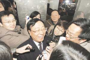 昨日上午10點(diǎn)左右,鐵道大廈大廳正門站著數(shù)十位翹首以待的記者,他們神情專注,因?yàn)榉吨飨苡锌赡軙谶@里出現(xiàn)。短暫的等待中,突然傳來一聲低語:“范主席來了!”聲音雖輕微,但已足夠令記者們興奮。