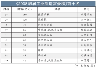 胡潤昨天首次發(fā)布《2008胡潤工業(yè)制造富豪榜》,據(jù)2008年9月1日市值計算,玖龍紙業(yè)的張茵家族以財富180億元排名第一(但根據(jù)11月12日股價,張茵家族財富縮水至74億元,梁穩(wěn)根取代張茵排名第一)。