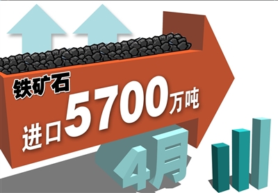 海關(guān)12日公布的數(shù)據(jù)顯示,4月份,我國鐵礦石進(jìn)口5700萬噸,創(chuàng)造了歷史新高。我國鐵礦石進(jìn)口自1月以來連續(xù)4個月攀升,1-4月份合計進(jìn)口鐵礦石18846萬噸,累計增長22.9%。