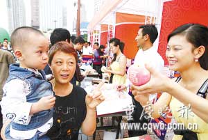 昨天的朝天門廣場,微風伴著細雨,氣溫適宜,不少市民前來玩耍。廣場中央,是一個用蘋果搭成的展覽塔,廣場一側(cè),是昭通市政府的蘋果展銷臺,堆積如山的蘋果吸引了廣大重慶市民,負責推銷的工作人員不停地給蘋果削皮,削好的蘋果很快就被市民吃了個精光。