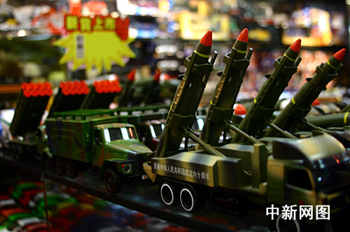 而在國(guó)際商貿(mào)城二期的旅游購(gòu)物中心一家玩具商鋪,“移動(dòng)加榴炮發(fā)射車”、“洲際導(dǎo)彈發(fā)射車”、“后勤保障車”等曾在閱兵式上“亮相”的軍事武器玩具模型,一個(gè)方陣一個(gè)方陣地排列著,接受著市場(chǎng)的“大閱兵”。