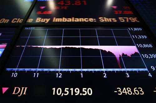 這是5月6日,紐約證券交易所內(nèi)電子顯示屏顯示的紐約股市收盤(pán)指數(shù)。在歐洲債務(wù)危機(jī)的重壓下,紐約股市6日暴跌,截至收盤(pán),三大股指的跌幅均超過(guò)3%,而道瓊斯指數(shù)盤(pán)中瞬間曾一度下跌近1000點(diǎn)。 新華社/路透