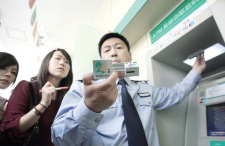 警方調(diào)取了銀行監(jiān)控錄像,發(fā)現(xiàn)在胡女士取錢之前,兩名男子在銀行進門處安裝了儀器裝備。據(jù)分析,兩男子是通過安裝讀卡器,獲取了胡女士卡內(nèi)信息,然后克隆銀行卡將存款轉(zhuǎn)走的。