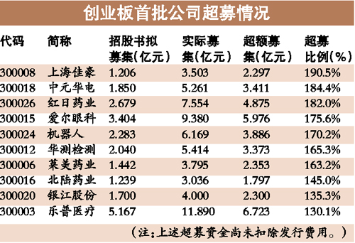 28家已發(fā)行的創(chuàng)業(yè)板公司全部存在超額募集資金現(xiàn)象。28家公司擬募集資金數(shù)量為70.784億元,實(shí)際募集資金154.784億元,28家公司合計(jì)超募83.184億元,平均每家公司超募2.971億元,這一數(shù)額甚至超過(guò)了個(gè)別中小板公司的募集資金額。