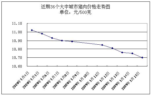 中新網(wǎng)5月18日電 據(jù)國家發(fā)展改革委價格監(jiān)測中心監(jiān)測,上周(2009.5.11-2009.5.15,下同)36個大中城市集市、超市豬肉(精瘦肉)平均零售價格每500克為10.77元,與前一周(2009.5.4-2009.5.8,下同)相比下降1.55%。
