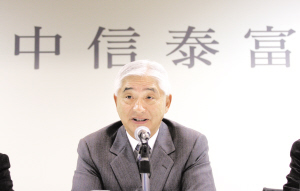 中信泰富有限公司25日公布,由于外匯合同所導(dǎo)致的變現(xiàn)及市場公允值的稅后虧損對公司溢利造成嚴(yán)重影響,中信泰富去年稅后股東應(yīng)占凈虧損為126.62億港元。董事會(huì)建議不派發(fā)末期股息,因此全年每股派息為中期股息的0.3港元。另外不派給董事們2008年全年的花紅。圖為榮智健在業(yè)績發(fā)布會(huì)上。