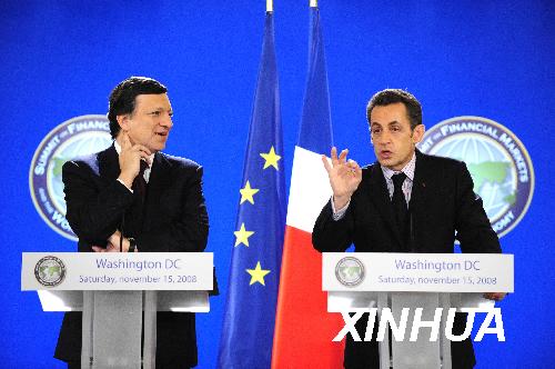 11月15日,在美國首都華盛頓出席二十國集團領(lǐng)導人金融市場和世界經(jīng)濟峰會的法國總統(tǒng)薩科齊(右)和歐盟委員會主席巴羅佐聯(lián)合舉行新聞發(fā)布會。 新華社記者張巖攝