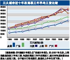 去年9月,調(diào)查歷時7個月的《2007年度廣東省薪酬福利調(diào)查報告》也顯示,廣深兩地的社會整體薪酬水平仍低于京滬兩地,總體上來說,和京滬比較,廣東在吸引和保留中、高端人才方面仍處于劣勢。