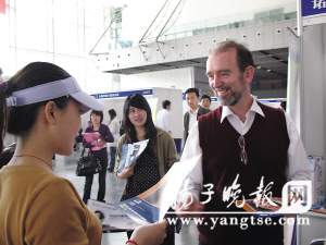 招聘會(huì)上,A036號(hào)展位人氣很足,令記者吃驚的是,展位前負(fù)責(zé)發(fā)放傳單的竟是一個(gè)外國(guó)人。他白襯衣加褐色背心,胸前掛著一副眼鏡。對(duì)路過(guò)展位的應(yīng)聘者,他不時(shí)遞上公司的傳單,面帶笑容,有時(shí)還用英文交流幾句,碰到用中文問(wèn)話的則一律回答“什么”,模樣十分可愛(ài)。展位的工作人員告訴記者,他們這次招募的是到美、英帶薪實(shí)習(xí)人員,而這位“老外”可不是打雜的,他是公司的高級(jí)咨詢師。