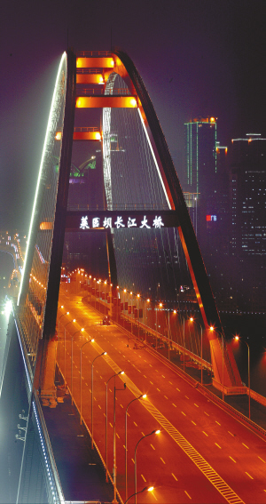 菜園壩長江大橋創(chuàng)下了三項(xiàng)世界第一:鋼箱拱梁跨距420米,為世界第一長;是世界第一座公路輕軌兩用城市大橋;也是世界第一座采用纜索吊機(jī)安裝的大橋。