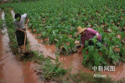 黃煙主產區(qū)主田鎮(zhèn)煙農在排積水、清洗煙葉泥漬。