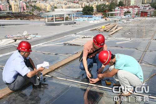 中鐵建工集團(tuán)技術(shù)人員正在對(duì)北京南站太陽能光伏電池板進(jìn)行單體測(cè)試