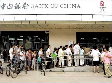 昨天上午9點左右,中國銀行北京知春路支行大門上已貼出通知,上面寫有“本網(wǎng)點沒有接到任何有關(guān)兌換奧運紀念鈔的通知”等字樣,落款為“中國銀行股份有限公司北京市分行”。中國銀行工作人員稱,是中國人民銀行而非中國銀行負責(zé)發(fā)行該奧運紀念鈔。多家媒體所刊登的報道也指出該紀念鈔由中國人民銀行發(fā)行,可能是部分市民將其看成中國銀行,才導(dǎo)致此次市民徹夜排隊。