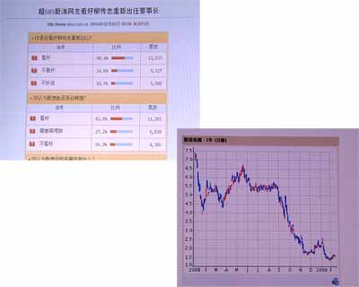 2月5日,聯(lián)想宣布柳傳志重掌聯(lián)想的消息后,新浪網(wǎng)隨后對柳傳志復(fù)出進行了問卷調(diào)查。截至第二天上午九點就有兩萬余人參與調(diào)查,結(jié)果顯示:58.4%的網(wǎng)友看好柳傳志重新出任董事長,選擇不看好的只有24.8%,認(rèn)為聯(lián)想因此能再創(chuàng)輝煌的網(wǎng)友達(dá)52.5%,市場層面也反應(yīng)積極,聯(lián)想集團股票在2月6日大漲11%,而在今年以來,聯(lián)想股價已經(jīng)下跌了33%。