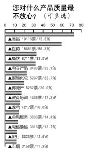 本次民調(diào)發(fā)現(xiàn),如今公眾對“食品”和“醫(yī)藥”的質(zhì)量最不放心,分別有72.3%和59.3%的人選擇此項(xiàng)。接下來依次是:餐飲(33.0%)、電子產(chǎn)品(32.1%)、服飾化妝(22.7%)、房地產(chǎn)(20.0%)、教育培訓(xùn)(17.2%)、家電(16.0%)、金融服務(wù)(14.4%)、電信通信(13.7%)、旅行(12.6%)、車輛(11.9%)。