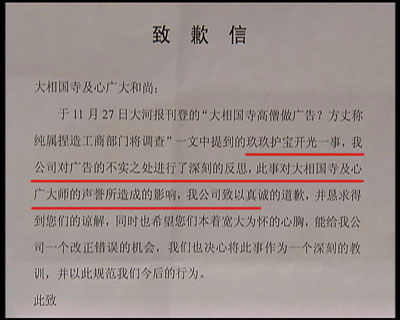 就在記者對玖玖理療褲的虛假廣告進行調查時,河南開封大相國寺向記者出具了一份玖玖理療褲河南開封經銷商,寫給大相國寺的一封致歉信,承認自己假冒僧人的錯誤行為,從此廣告中來自大相國寺的高僧空智,就如同人間蒸發(fā),再也沒有出現(xiàn)過,取而代之的是佛教禪宗第36代傳人,但卻有著相同的名字和面孔——空智。