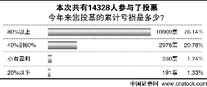 上周,中國證券網(wǎng)進(jìn)行了“今年來您投基累計虧損為多少”的調(diào)查,獲得了投資者廣泛關(guān)注,共有14328人參與了投票。結(jié)果顯示,有10909名投資者損失達(dá)到了80%以上,達(dá)到全體投票者總數(shù)的76.14%。選擇虧損在40%-60%的基民人數(shù)為2978,占投票者總數(shù)的20.78%。191名投資者損失低于20%,占投票者總數(shù)的1.33%。只有250名基民表示,今年以來小有盈利,僅占全部投票者的1.74%。