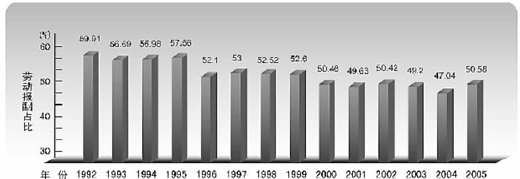 從國際口徑統(tǒng)計(jì)結(jié)果看,我國勞動(dòng)報(bào)酬占比的基本走勢和國內(nèi)口徑統(tǒng)計(jì)相一致,但差距縮小。從1992年到2005年,除了2003年、2004年低于50%外,其他年份勞動(dòng)報(bào)酬占比均在50%以上。
