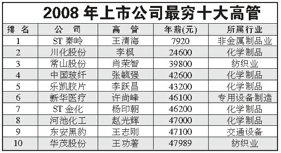 在最窮總經(jīng)理前十中,化學(xué)制品行業(yè)占據(jù)了5人,其他的行業(yè)則較為分散。另外,這十位總經(jīng)理所在的上市公司,有3家2008年凈利潤虧損,有7家凈利潤同比下降。