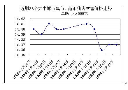 中新網(wǎng)7月28日電 國家發(fā)改委網(wǎng)站消息,據(jù)國家發(fā)展改革委價(jià)格監(jiān)測(cè)中心監(jiān)測(cè),上周(2008.7.21-2008.7.25,下同)全國36個(gè)大中城市集市、超市豬肉(精瘦肉)平均零售價(jià)格每500克為14.38元,與前一周(2008.7.14-2008.7.18,下同)相比下降0.13%。