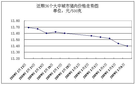 中新網(wǎng)3月9日電 據(jù)國家發(fā)改委網(wǎng)站消息,據(jù)國家發(fā)展改革委價(jià)格監(jiān)測(cè)中心監(jiān)測(cè),上周(2009.3.2-2009.3.6,下同)全國36個(gè)大中城市集市、超市豬肉(精瘦肉)平均零售價(jià)格每500克為12.49元,與前一周(2009.2.23-2009.2.27,下同)相比下降1.19%。