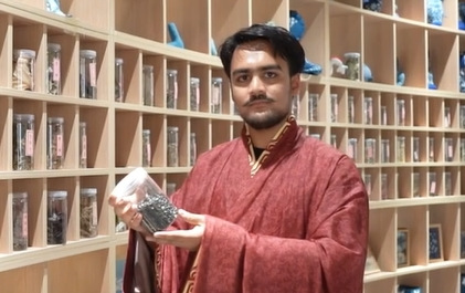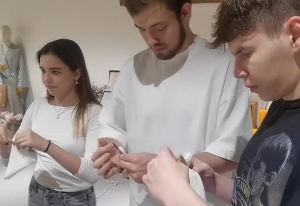 | 將荷葉自池塘里摘下,用手反復(fù)揉搓,讓紗布與汁液充分融合,稍等片刻,一塊黃色的紗巾就出現(xiàn)在段惠的手中。 |