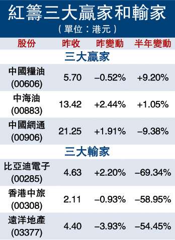 紅籌指數(shù)成分股上半年整體回報率為負22%,表現(xiàn)最令投資者失望的,是比亞迪電子,股價累跌69%;仡櫮瓿鯐r,比亞迪電子股價曾經飆升至15.5元的歷史高位,可謂無緣無故的上升,到大市興奮過后,終于回復理性,比亞迪電子股價亦落葉歸根,昨日收報4.63元。此外,香港中旅(00308)是第二大跌幅股份,上半年下跌58%,收報2.11元。分析員解釋,市場去年憧憬中旅獲注資、分拆業(yè)務上市,刺激股價暴升,如今遂作出回調。