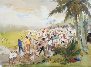 我鉆進(jìn)椰子林作畫,其熱無比,連油色的錫管都燙手。忘了在何處,林中小蟲特多,咬得緊,穿著長褲、長袖襯衣,且將袖口和衣領(lǐng)都包得嚴(yán)嚴(yán)實實,但回到宿店才知滿身都是紅塊塊,奇癢難忍,店主頗可憐我,說:氓!氓!我聽不懂廣東話,她用筆寫,原來是蚊。