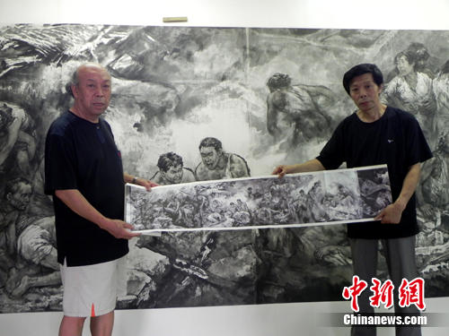 記者在唐山市一社區(qū)里,見(jiàn)到了四位作者中的喬文科與孫淑文。據(jù)二位畫(huà)家介紹,《唐山大地震祭》巨幅水墨畫(huà)長(zhǎng)卷裝裱完后高2.35米,長(zhǎng)度近百米,歷經(jīng)四年艱苦努力,終于完成。