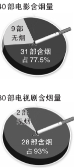 從2007年開始,中國控?zé)焻f(xié)會(huì)每年都會(huì)對(duì)熱播的國產(chǎn)影視劇中的吸煙鏡頭進(jìn)行監(jiān)測(cè)統(tǒng)計(jì)。對(duì)2009年熱播的40部電影和30部電視劇進(jìn)行的監(jiān)測(cè)結(jié)果顯示:在40部電影中有9部電影完全沒有煙草鏡頭,31部影片有煙草鏡頭,占影片的77.5%;30部電視劇中,2部沒有煙草鏡頭,28部有煙草鏡頭,占電視劇比例的93%。
