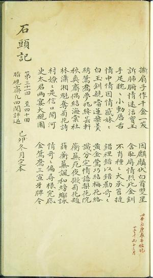 己卯本存四十一回又兩個(gè)半回,此本在31-40回的總目后寫有“脂硯齋凡四閱評過”、“己卯冬月定本”字樣,故稱。“己卯”為乾隆二十四年(1759),此紀(jì)年應(yīng)是此本底本的紀(jì)年,現(xiàn)存為過錄本。在這個(gè)過錄本上,有700余條雙行小字批語,另據(jù)此本上“祥”、“曉”字的避諱,研究者比對《怡府書目》,考定此本為怡親王允祥、弘曉府上的抄藏本,聯(lián)系到雍正二年御批中曾有“你(指曹頫,雪芹之父或叔父)是奉旨交與怡親王傳奏你的事的……”可知怡親王府與曹家的特殊關(guān)系,此本的底本或許就來自曹家,其價(jià)值可想而知。己卯本第1-20回、31-40回、61-70回(內(nèi)64、67兩回由后人補(bǔ)抄)原由董康、陶洙所藏,現(xiàn)藏國家圖書館;第55回下半至第59回上半現(xiàn)藏國家博物館。